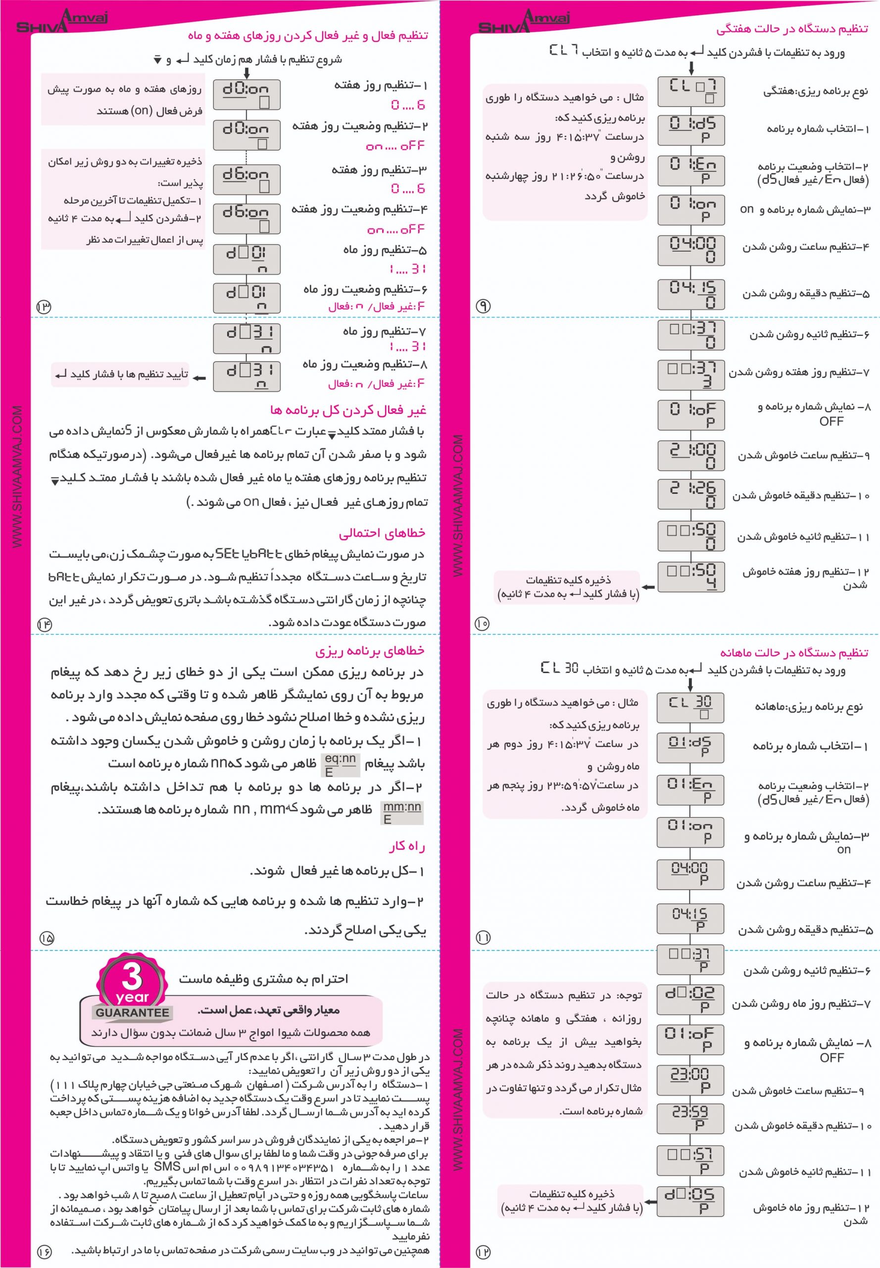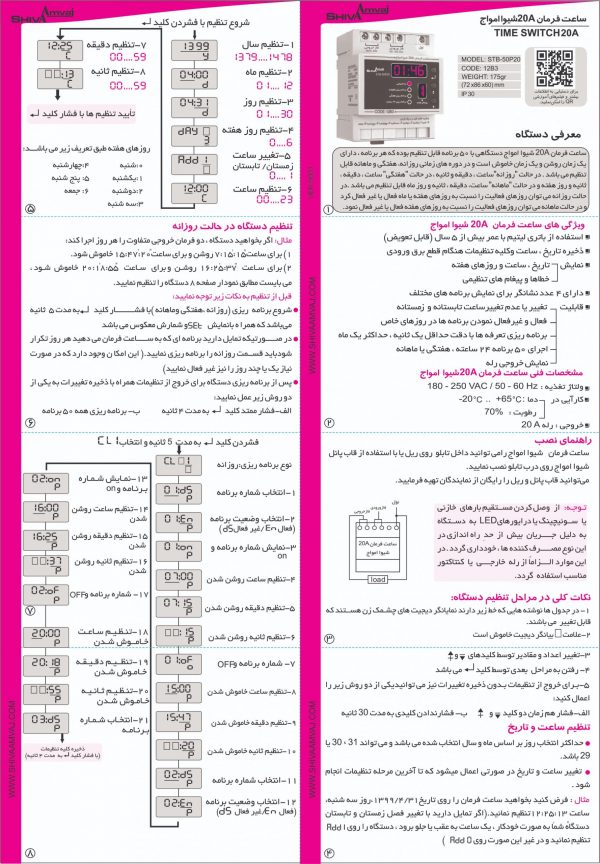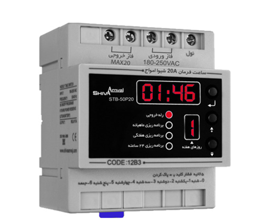 ساعت فرمان۲۰آمپر شیواامواج،یک ساعت با یک فرمان خروجی می باشد که می تواند ۵۰ برنامه داشته باشد. هر برنامه ، دارای یک زمان روشن و یک زمان خاموش است و در دوره های زمانی روزانه، هفتگی و ماهانه قابل تنظیم می باشد . در حالت “روزانه”ساعت ، دقیقه و ثانیه ، در حالت “هفتگی” ساعت ، دقیقه ، ثانیه و روز هفته و در حالت “ماهانه” ساعت، دقیقه ، ثانیه و روز ماه قابل تنظیم می باشد .در حالت روزانه می توان روزهای فعالیت را نسبت به هفته یا ماه فعال یا غیر فعال کرد و در حالت ماهانه می توان روزهای فعالیت را نسبت به روزهای هفته فعال یا غیر فعال نمود.